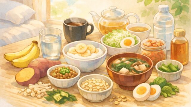 便秘でつらい朝、今すぐ何を食べればいい?早く腸内環境を整えることが期待できる食べ物&飲み物を厳選。コンビニ腸活、1日メニュー、やりすぎNGについても解説します。