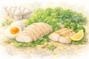 ② たんぱく質(焼き魚/サラダチキン/豆腐/卵など)