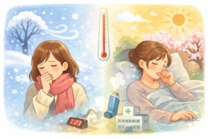 寒暖差で咳が出る人の多くは、「冷たい空気に触れた瞬間」や「朝晩の冷え込みが強い時間帯」に症状が出やすい傾向があります。日本呼吸器学会の一般向け情報でも、喘息では夜間や早朝に症状が出やすく、冷気で誘発されることがあると示されています。