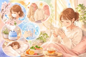 家でできる対策としては、冷気や乾燥を避ける、急な温度差を減らす、花粉や刺激を持ち込みにくくする、皮膚をこすりすぎない、そして無理をしすぎず休息をとることが基本になります。こうした小さな工夫の積み重ねが、春先の不調をやわらげてくれます。