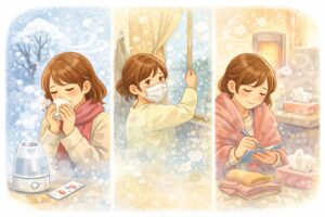 咳が出やすいときは、マスクやネックウォーマーで冷気を直接吸い込みにくくし、乾燥を避けることが大切です。鼻水には、室内外の温度差を減らし、鼻を強くかみすぎず、花粉やほこりを持ち込みにくい工夫が役立ちます。