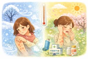 こうした咳は、「寒いから出る」というより、温度差や冷気という刺激に、気道が敏感に反応していると考えるとわかりやすくなります。とくに、もともとアレルギー体質の人や、過去に喘息・咳喘息を指摘されたことがある人では、春先に咳がぶり返すことがあります。