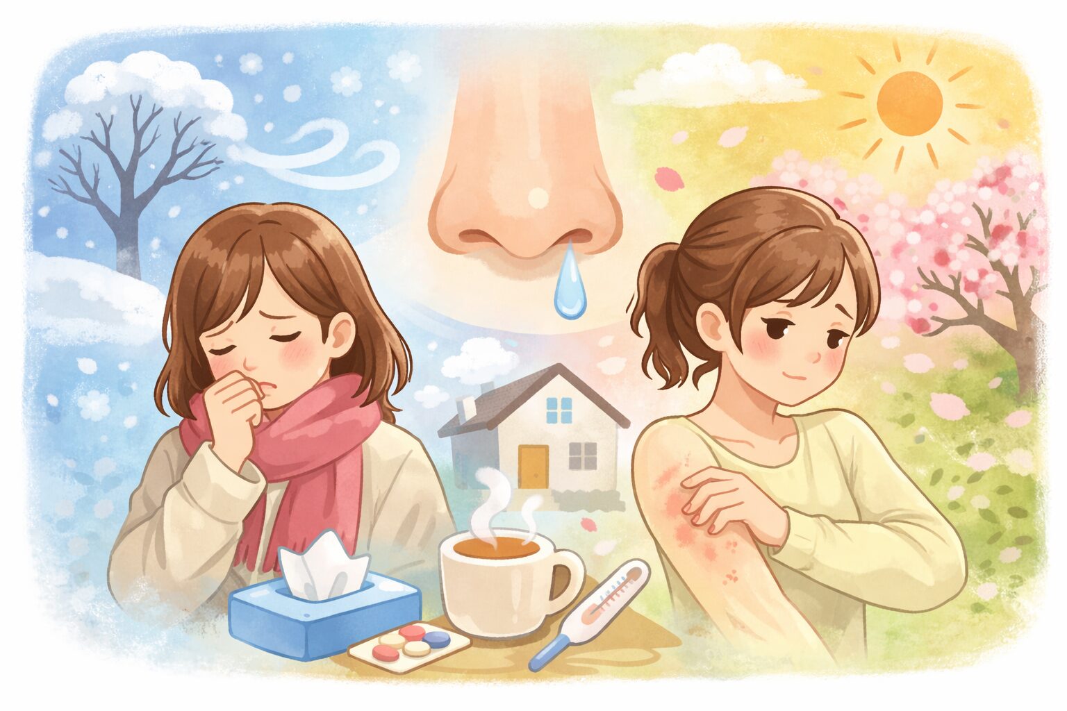 春先になると、「風邪ではなさそうなのに咳が出る」「鼻水がずっと透明のまま」「寒い日に肌がむずむずして赤くなる」――そんな不調に戸惑う方は少なくありません。