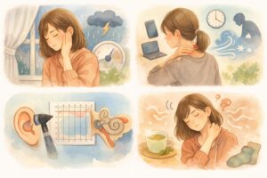 天候の変化で耳鳴りや首こりがつらくなることはありますが、原因はひとつではありません。耳鳴りは耳の状態や聴こえの変化が関わることがあり、首こりは姿勢や筋緊張、冷え、疲れなどが重なって強く出ることがあります。