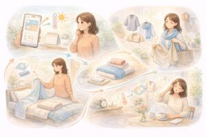 バッグに一枚羽織りを入れておくこと。寝室に薄手ケットを置いておくこと。朝の天気予報で最高気温も見ること。そうした小さな工夫は目立たなくても、毎日を確かに支えてくれます。