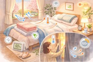 朝方だけ冷える室温、乾燥しすぎた空気、早朝の光、窓から入る音。そうしたものが重なると、寝具を整えていても眠りが浅くなることがあります。だからこそ春は、寝具だけではなく、部屋全体の環境も一緒に見ていくことが大切です。