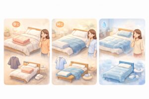 「朝晩は寒いのに昼は暑い」「夜中に暑くて目が覚める」「寝具はいつ替えるべき?」という迷いに、やさしくお答えします。