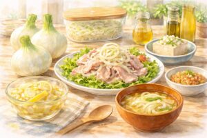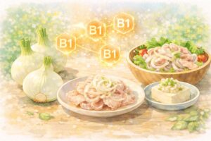 新玉ねぎそのものが疲労を直接回復させると断定することはできません。ただ、玉ねぎの硫黄化合物はビタミンB1との関係で紹介されることがあり、豚肉などビタミンB1を含む食品と組み合わせる食べ方は、疲れやすい毎日の栄養補給として取り入れやすい方法です。