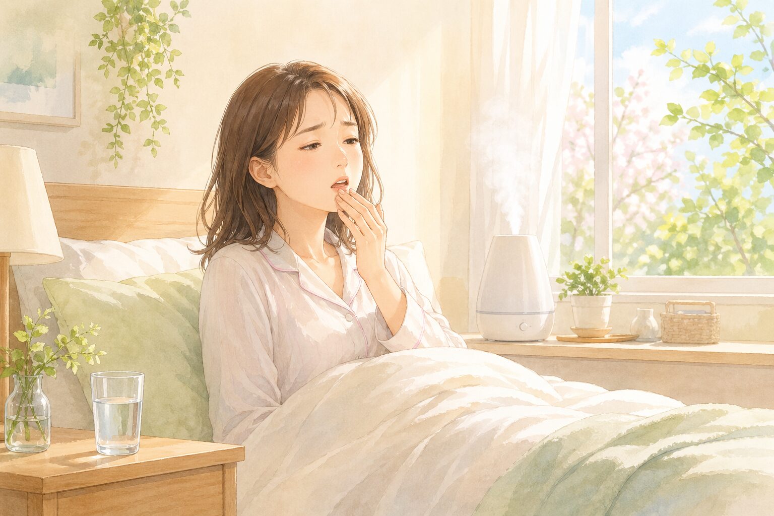 ただし、寝室の空気が乾いていて口やのどの乾燥感が強い場合は、乾いた空気をやわらげる補助策になることがあります。