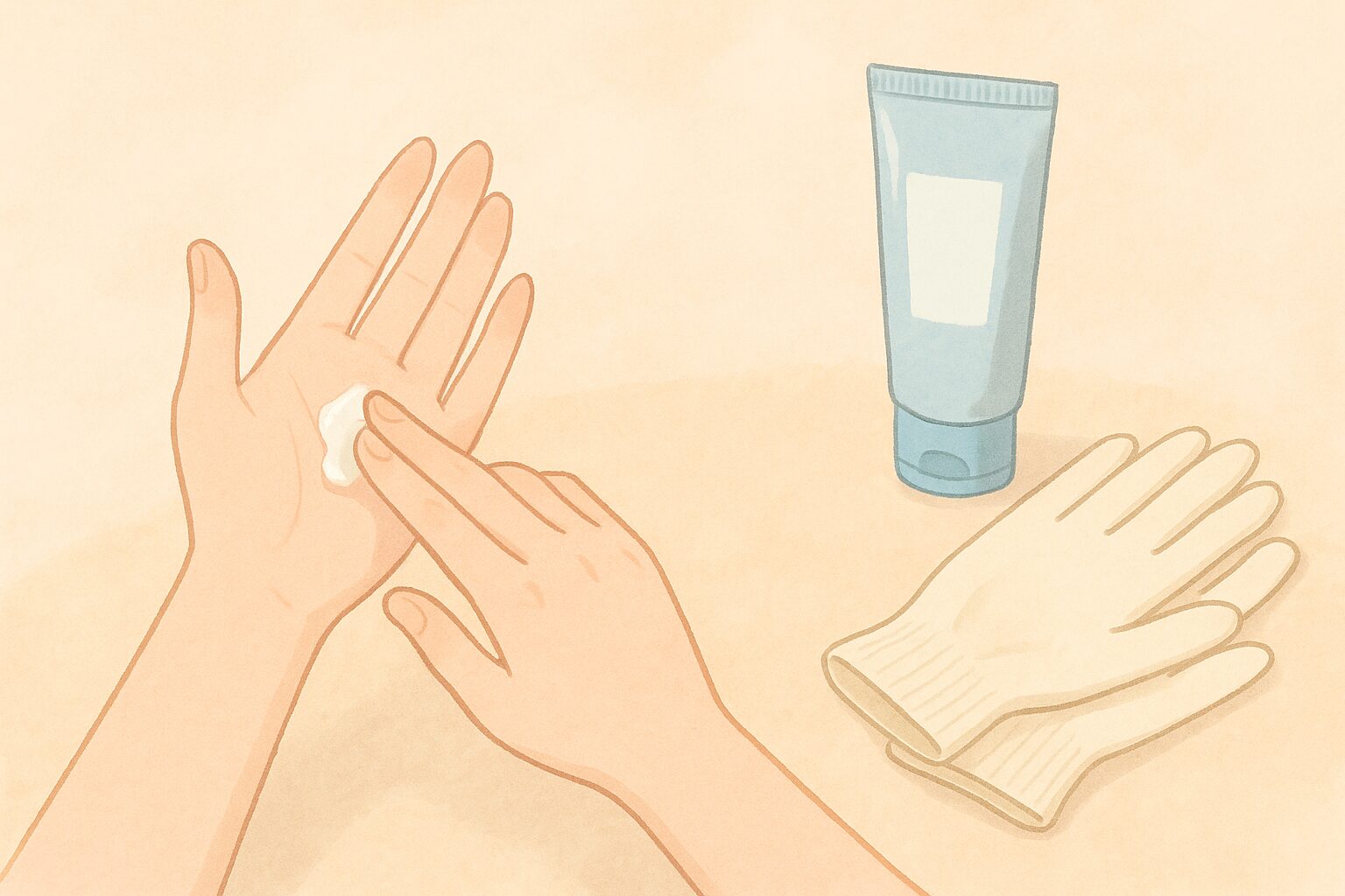 - 綿手袋を着けて就寝:保湿剤の蒸発を防ぎ、手全体をしっとりと包み込みます。
