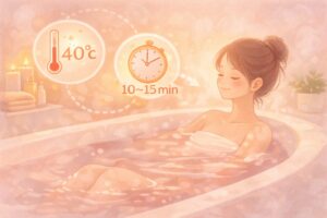 ただし、心臓や血圧に不安がある方、のぼせやすい方は無理をせず、半身浴や短めの全身浴など、自分の体調に合わせて調整してください。目安は38〜40℃で10〜15分程度です。